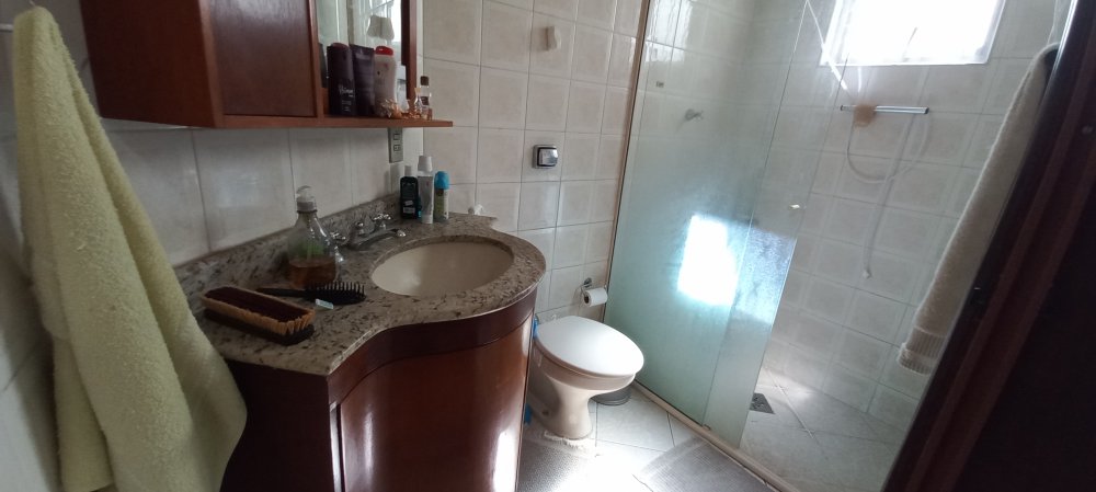 Piso frio, laje, cozinha e banheiros azulejados até o teto, box Blindex