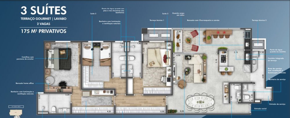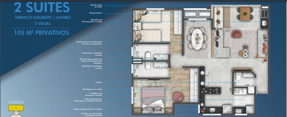 160,00m2 de área contendo: 3 dormitórios (3 suítes, sendo 1 master), sala de estar, sala de jantar, banheiro social, cozinha, área serviço, varanda gourmet, 2 vagas na garagem.