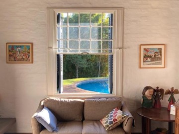 ACABAMENTO: Paredes de tijolos maciços caiados de branco, vigas aparentes de maçaranduba, apoiando toda a cobertura de quatro águas e duas "mansardas", com telhas francesas. As janelas de ferro e vidro, peças raras, guilhotina com contrapeso restauradas, foram havidas em demolição de casa antiga na Av. Paulista. Ladrilhos hidráulicos, azulejos, vitrôs, portas e janelas venezianas em madeira, oriundos de demolições do Vale do Paraíba e Minas Gerais.