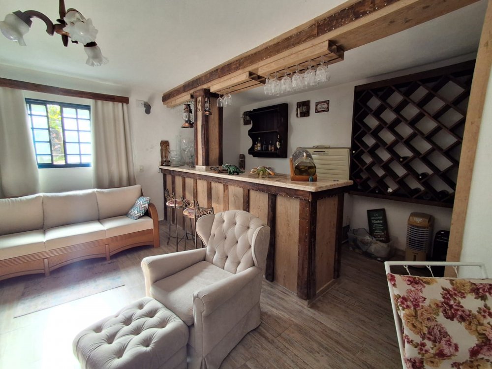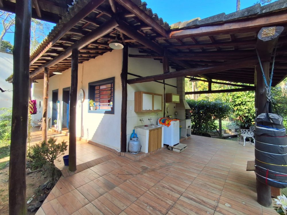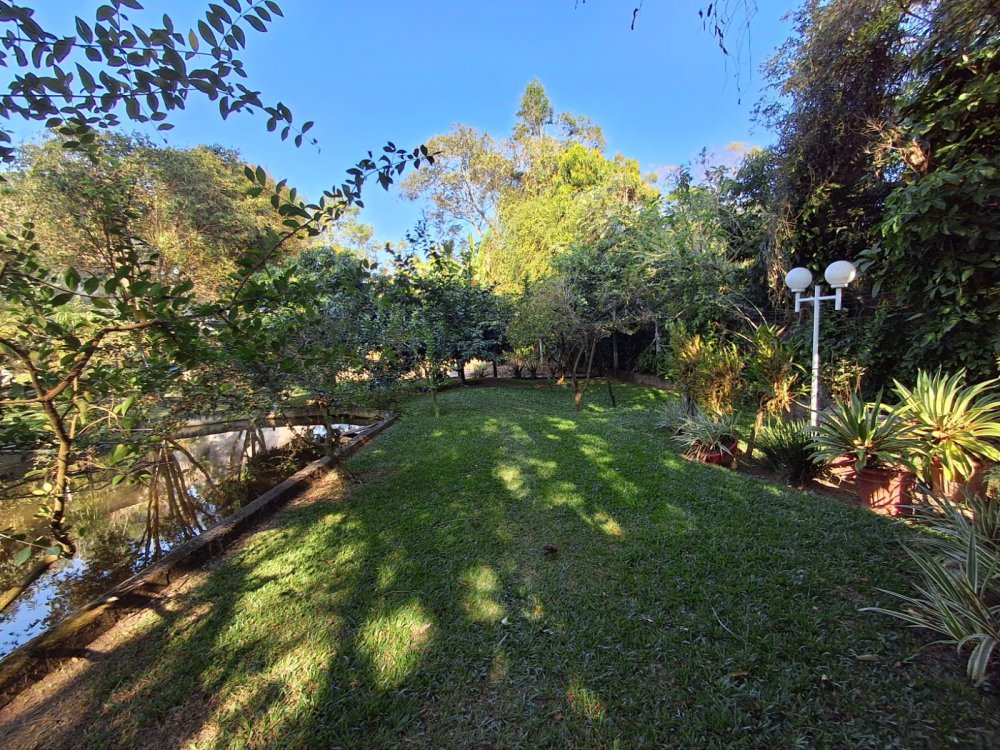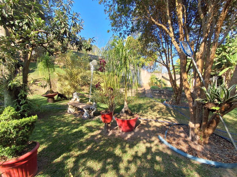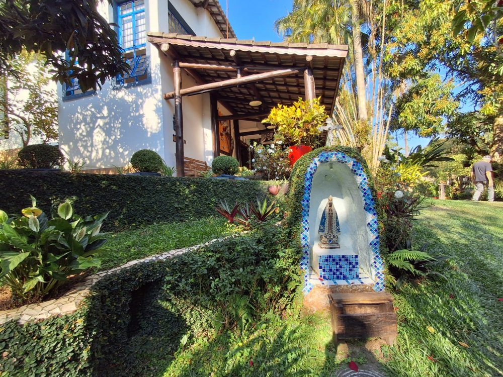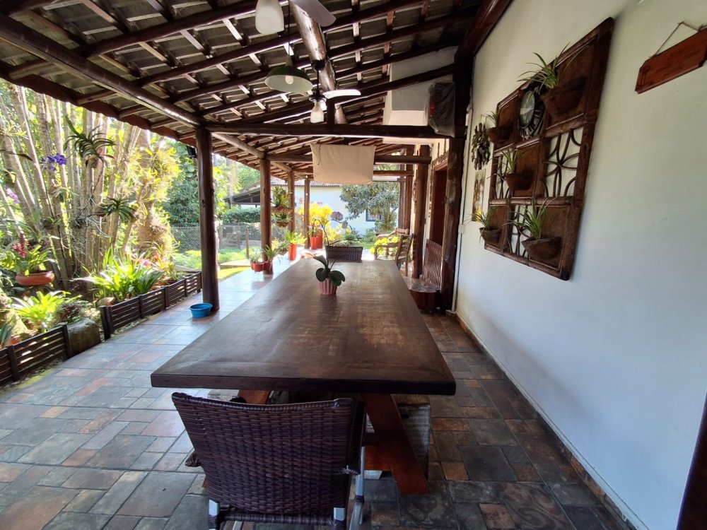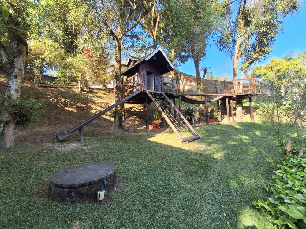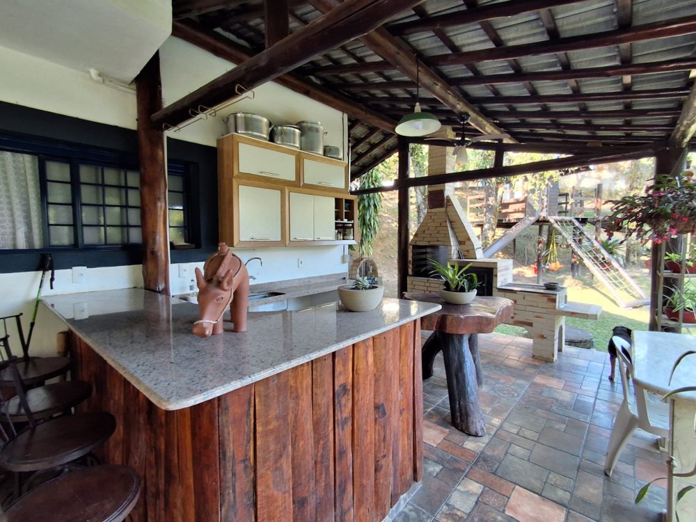 BENFEITORIAS: BELA ACONCHEGANTE E CONFORTÁVEL SEDE, TOTALMENTE MOBILIADA E DECORADA COM FINO GOSTO, contendo: 5 dormitórios (3 suítes), amplas salas de estar e jantar, cozinha completa, despensa, VARANDA FRONTAL VOLTADA PARA OS JARDINS, com grande mesa em MADEIRA MACIÇA compondo a ÁREA GOURMET com churrasqueira, forno e fogão à lenha. BRINQUEDOS INFANTIS: Casa de boneca, escorregador, mirante e outros.