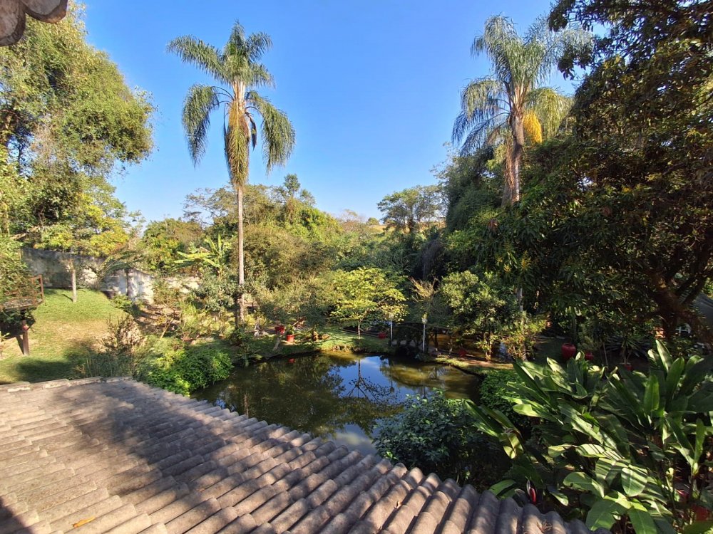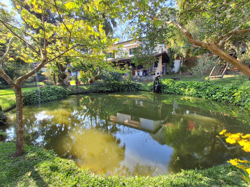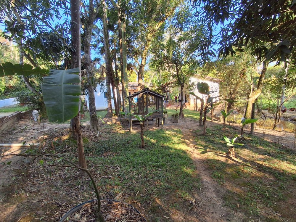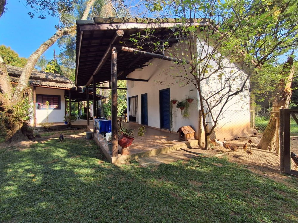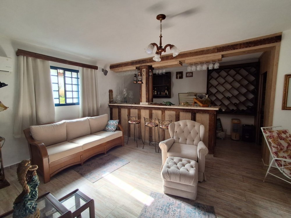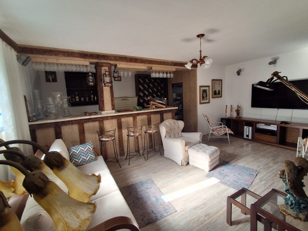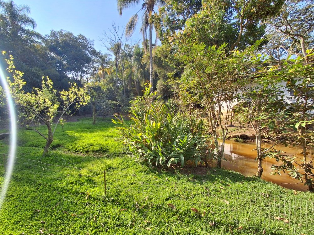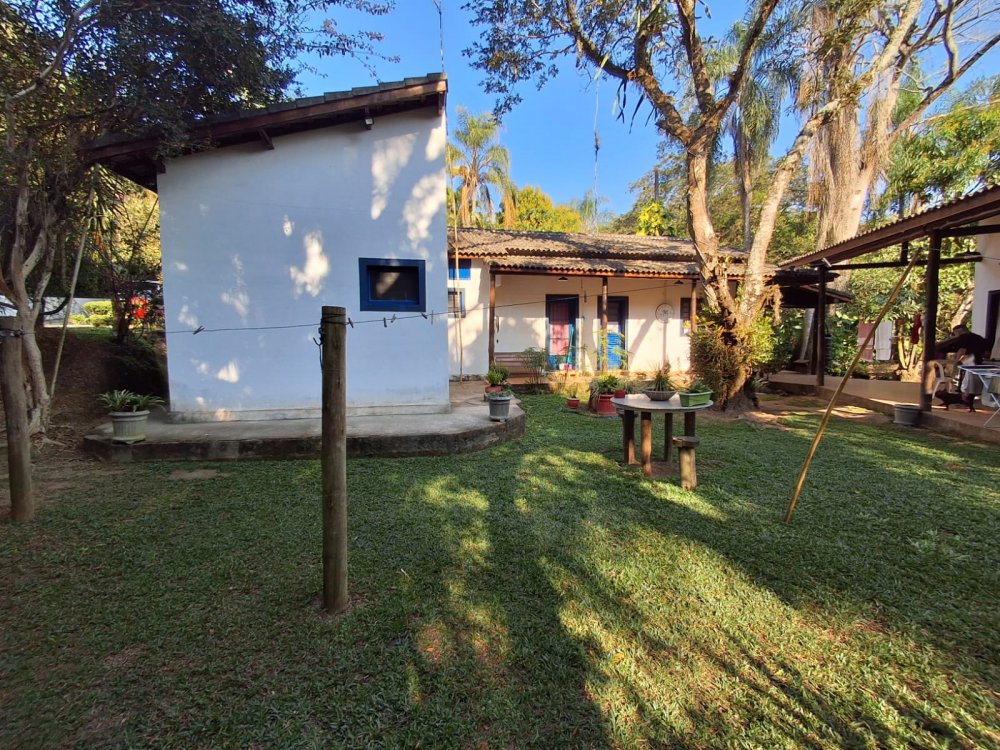 BENFEITORIAS: BELA ACONCHEGANTE E CONFORTÁVEL SEDE, TOTALMENTE MOBILIADA E DECORADA COM FINO GOSTO, contendo: 5 dormitórios (3 suítes), amplas salas de estar e jantar, cozinha completa, despensa, VARANDA FRONTAL VOLTADA PARA OS JARDINS, com grande mesa em MADEIRA MACIÇA compondo a ÁREA GOURMET com churrasqueira, forno e fogão à lenha. BRINQUEDOS INFANTIS: Casa de boneca, escorregador, mirante e outros.