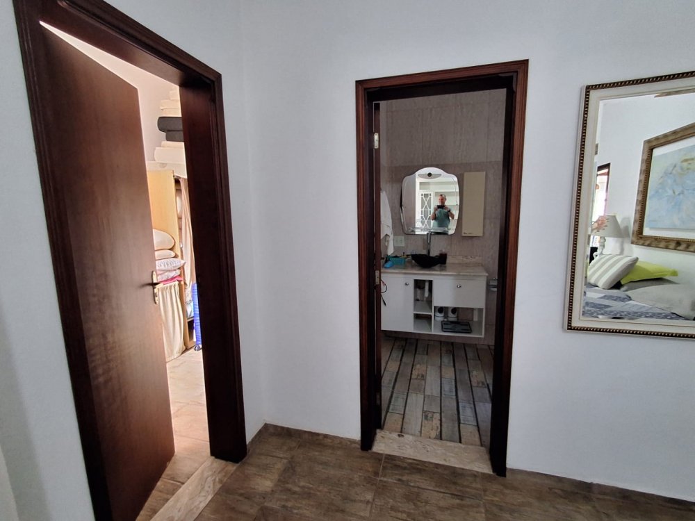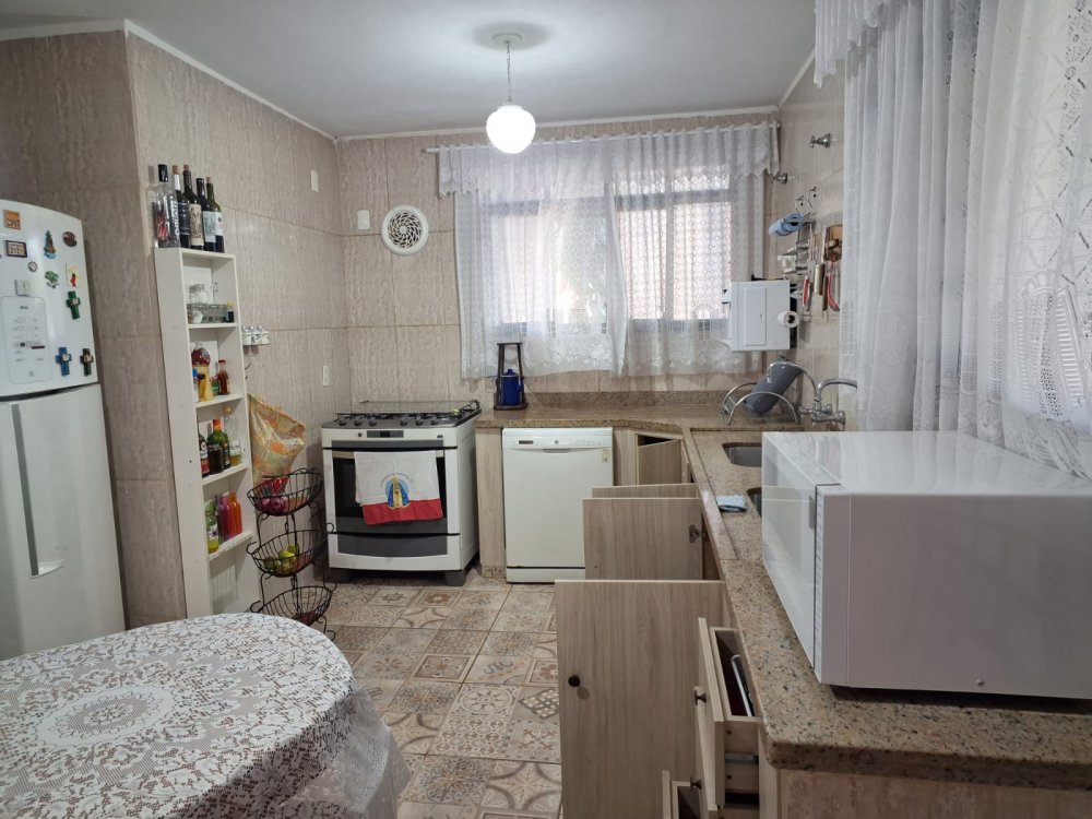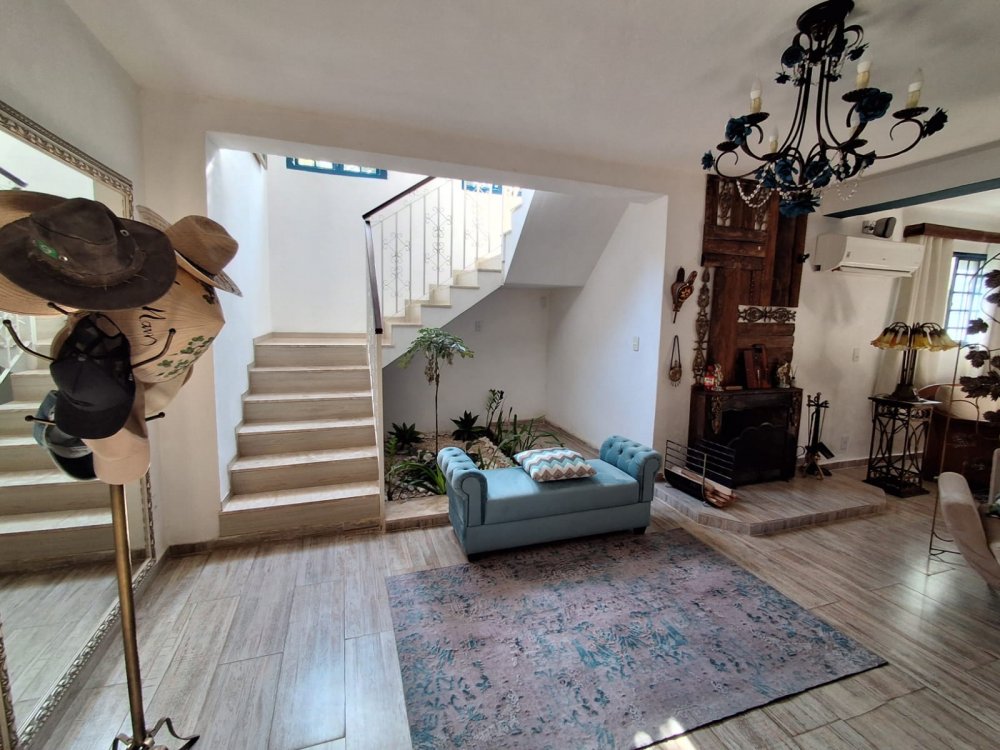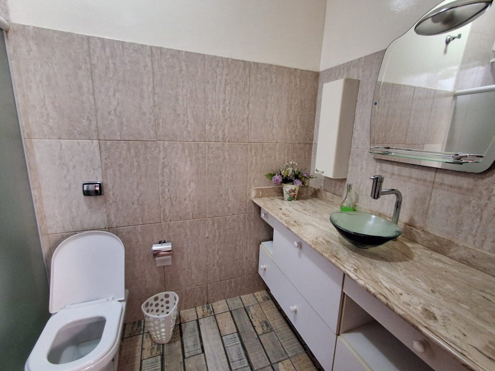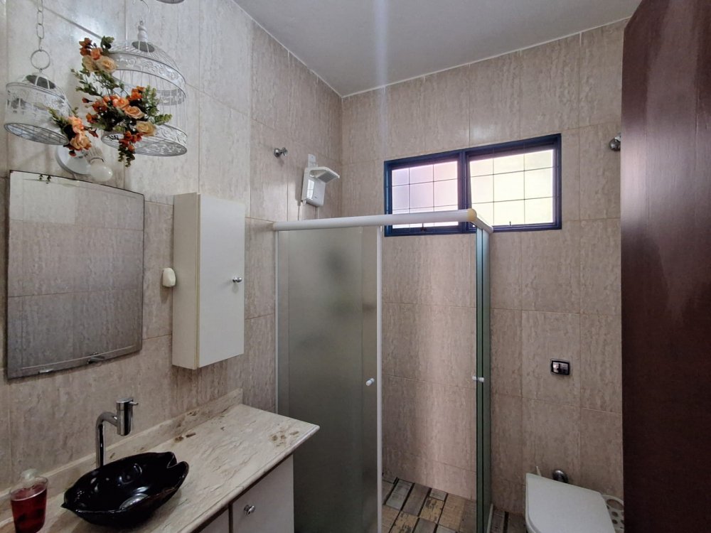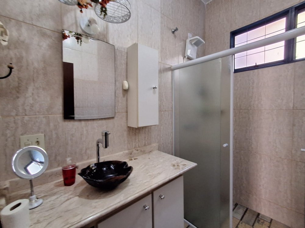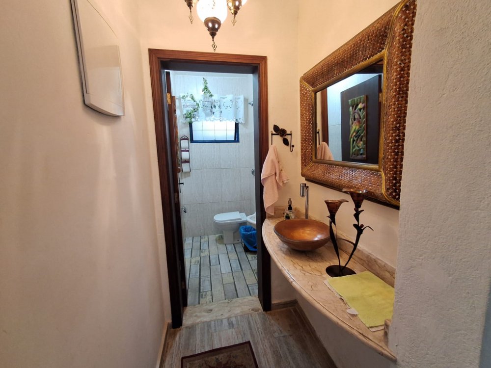 ACABAMENTO ESMERADO: Escada com degraus em granito, bancadas e pia em granito, gabinete em fórmica, lavatórios com bancadas em mármore travertino. Garagem descoberta para 5 autos.