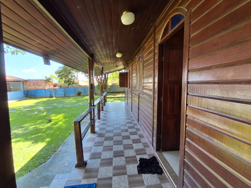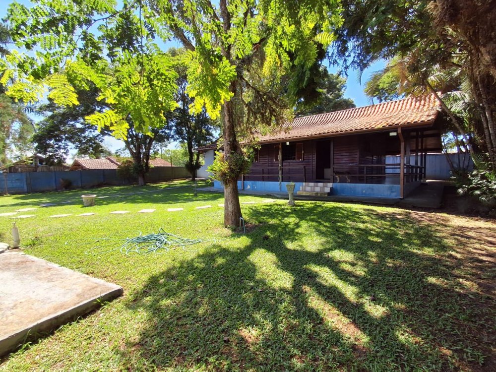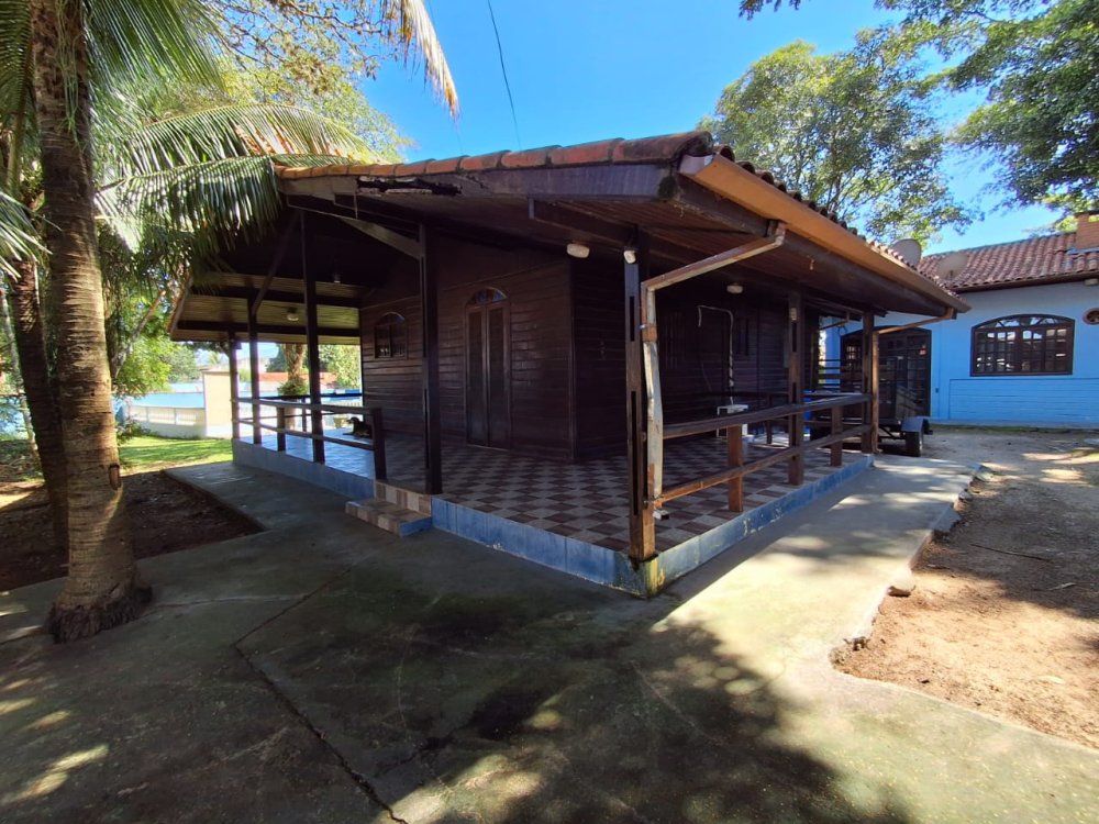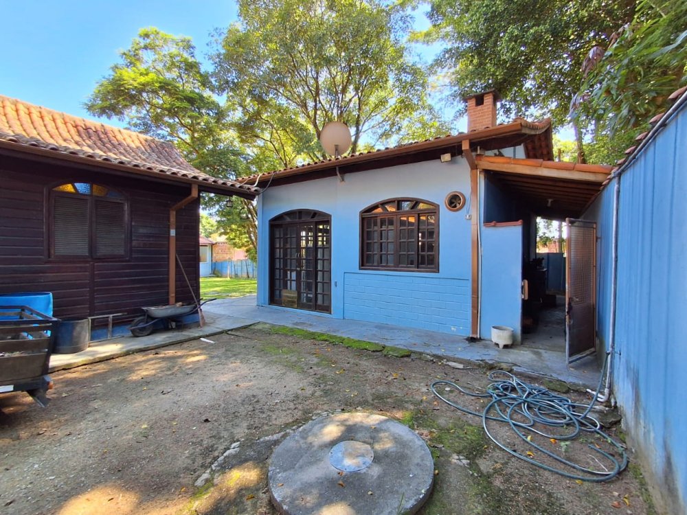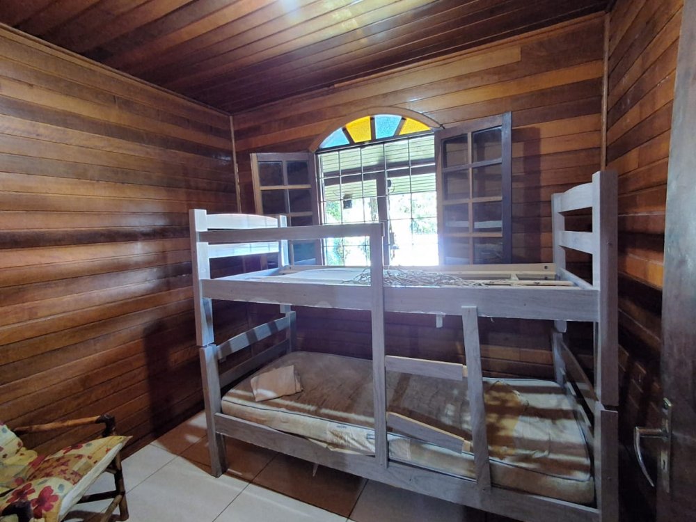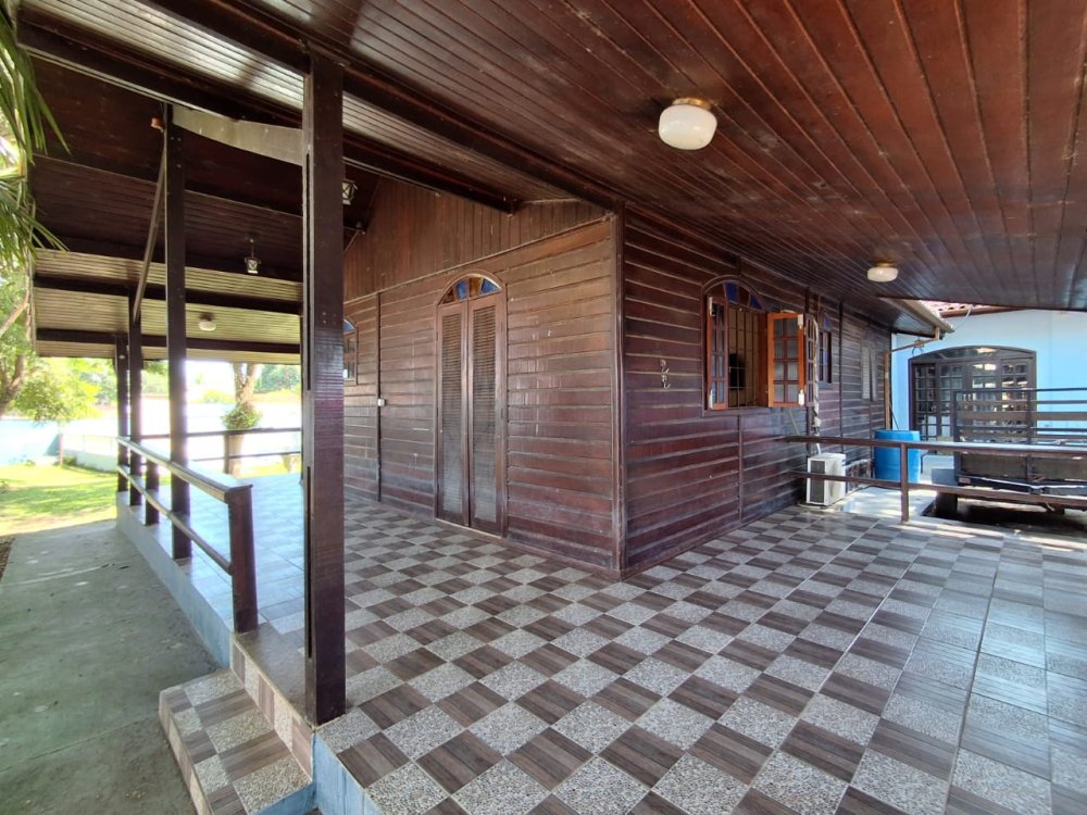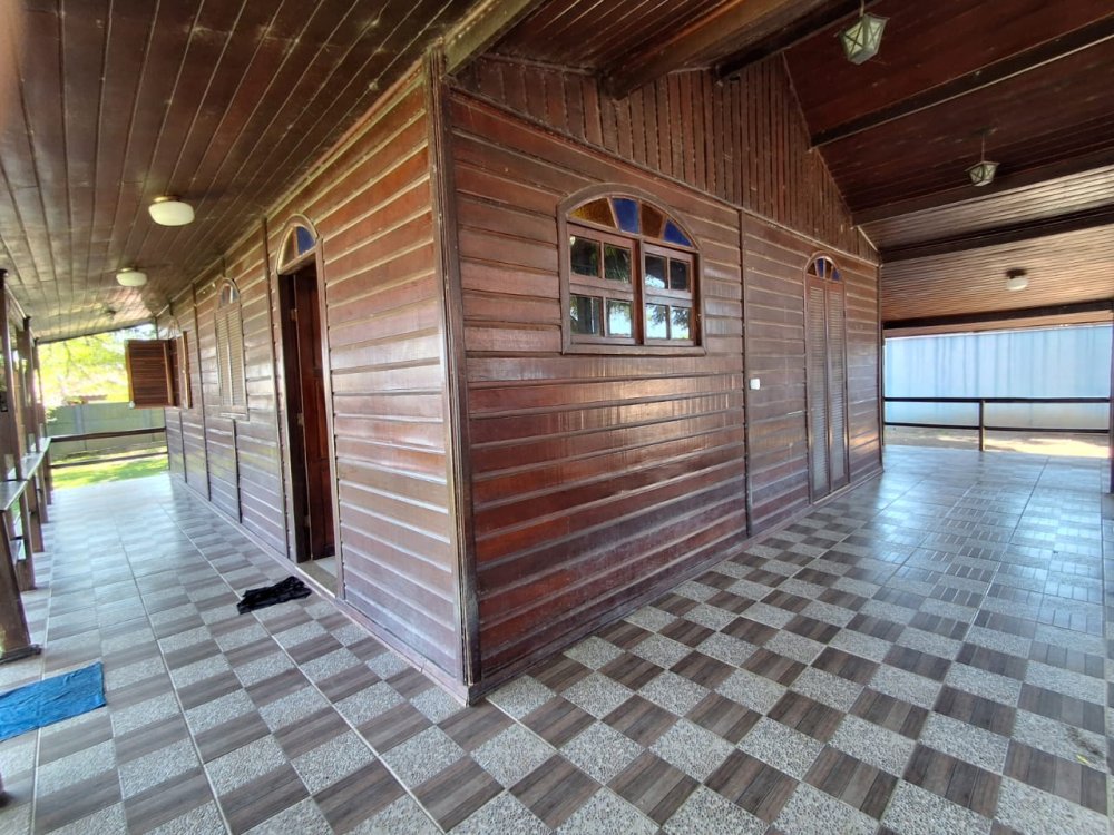 BENFEITORIAS: CASA DE MADEIRA COM VARANDADA EM "U", contendo: 3 dormitórios, sala, banheiro social, grande varanda. COZINHA SEPARADA com churrasqueira, banheiro e quarto de despejo. AMPLO SALÃO (ÁREA GOURMET), com churrasqueira, forno e fogão à lenha, banheiros masculino e feminino, área toda cercada por balaústres, em torno da piscina (3,5x7), com cascata.