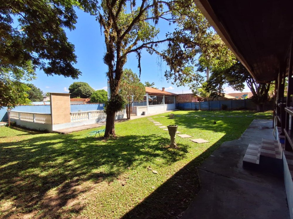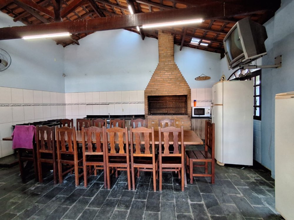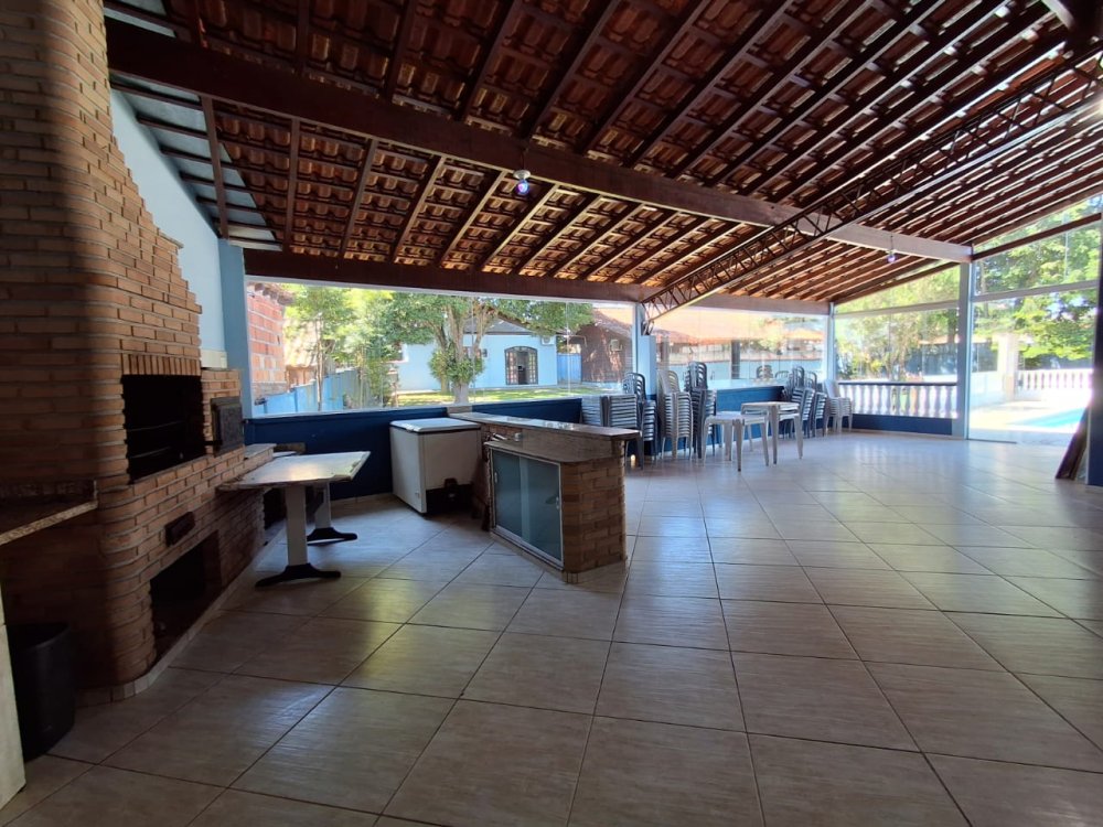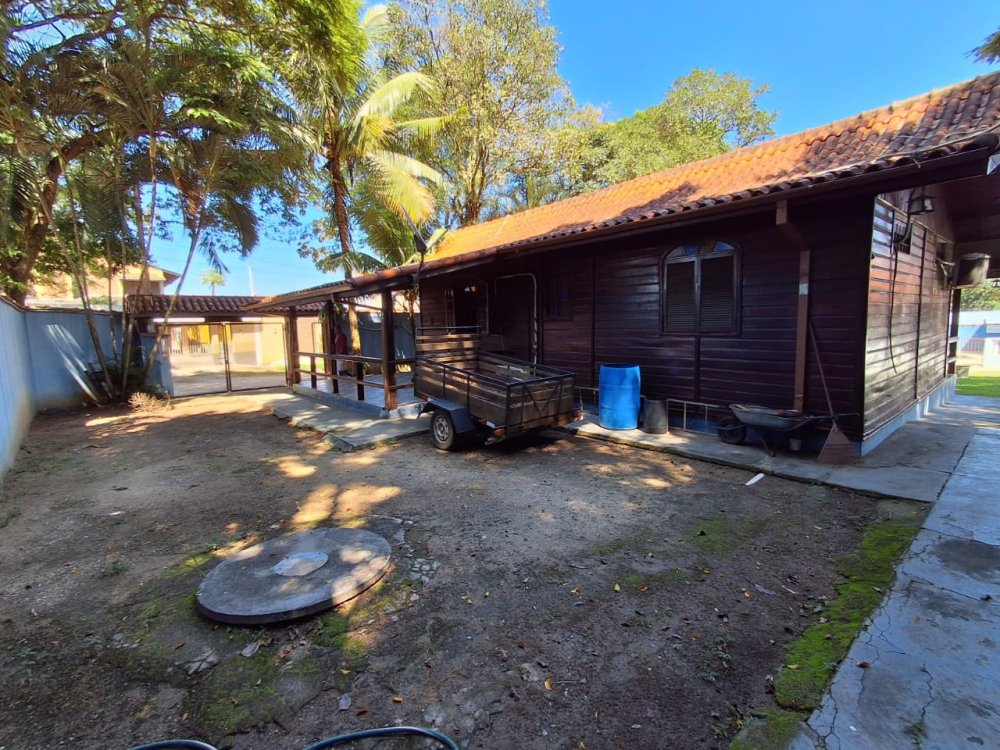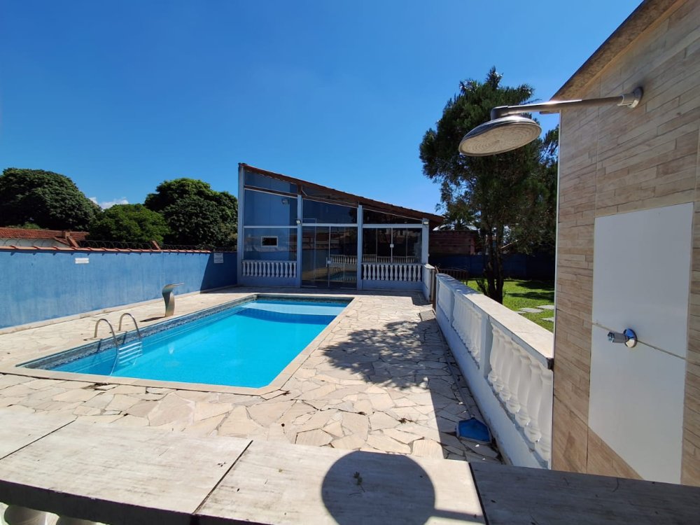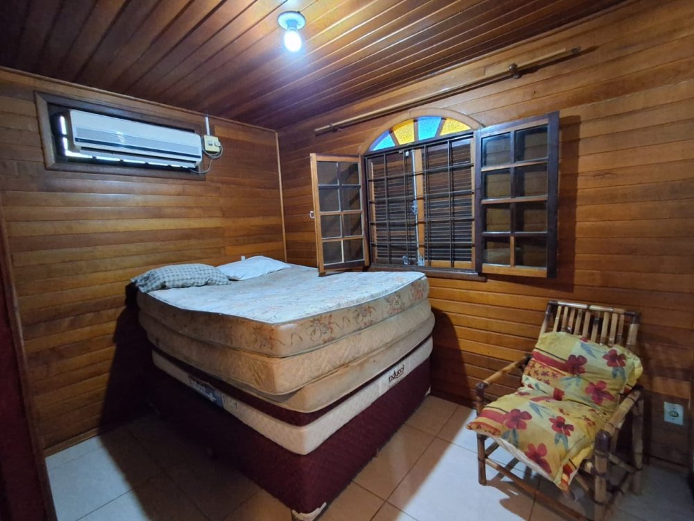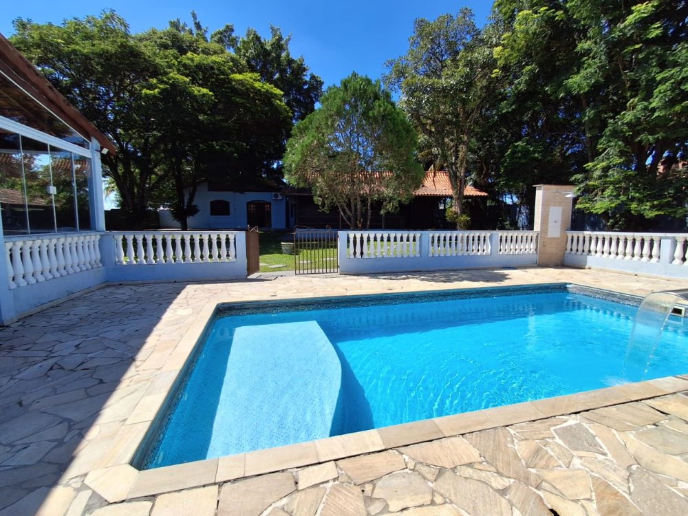 BENFEITORIAS: CASA DE MADEIRA COM VARANDADA EM "U", contendo: 3 dormitórios, sala, banheiro social, grande varanda. COZINHA SEPARADA com churrasqueira, banheiro e quarto de despejo. AMPLO SALÃO (ÁREA GOURMET), com churrasqueira, forno e fogão à lenha, banheiros masculino e feminino, área toda cercada por balaústres, em torno da piscina (3,5x7), com cascata.