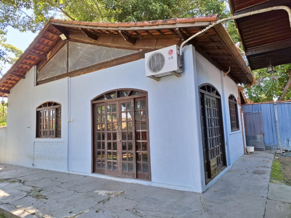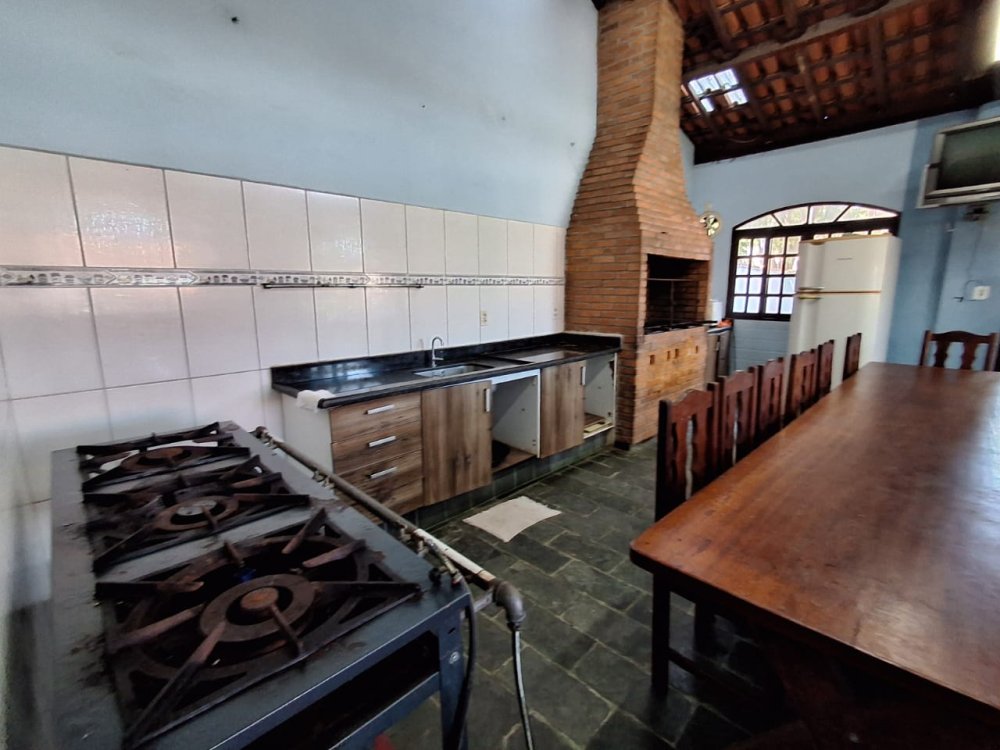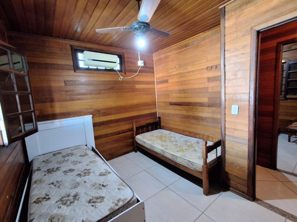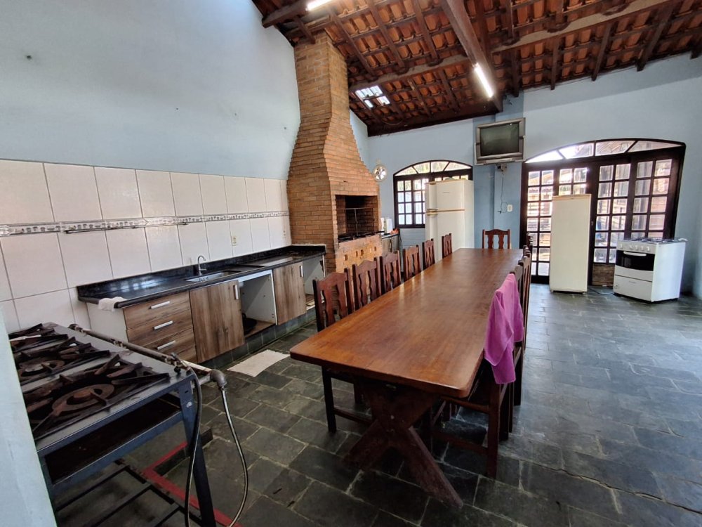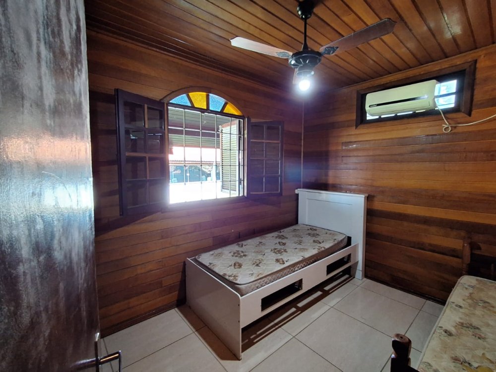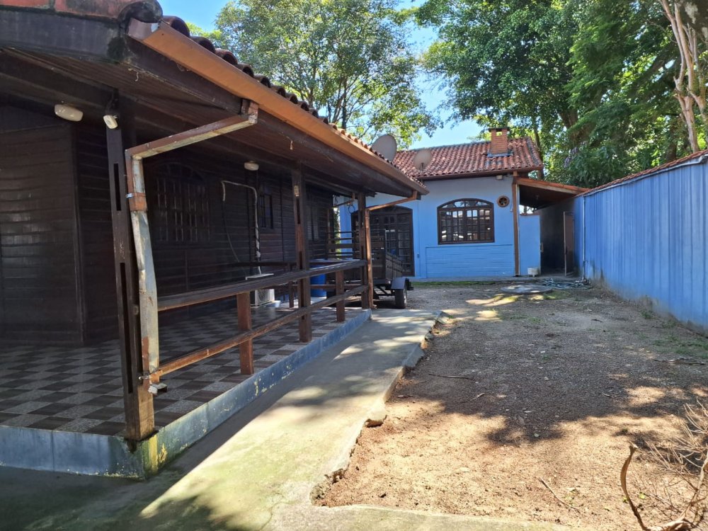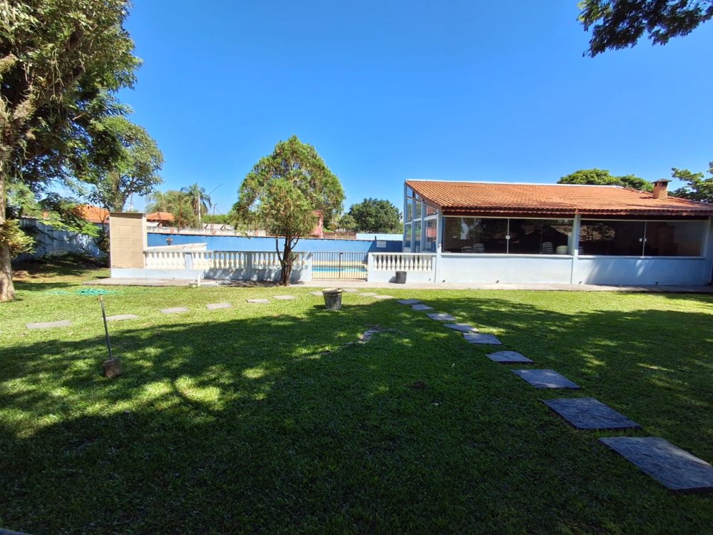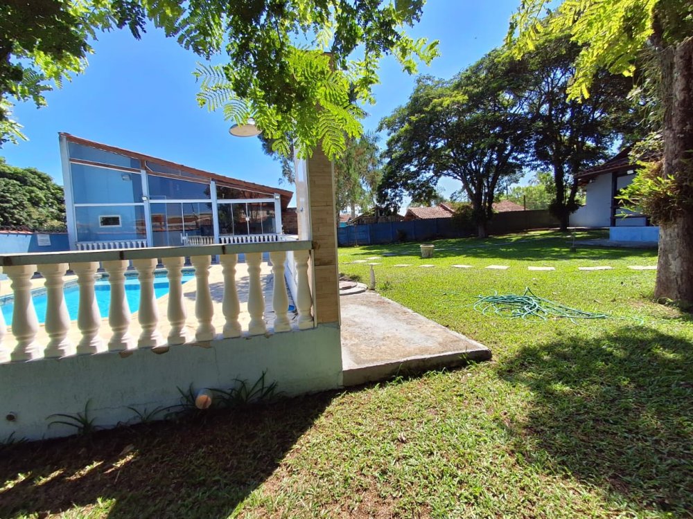 BENFEITORIAS: CASA DE MADEIRA COM VARANDADA EM "U", contendo: 3 dormitórios, sala, banheiro social, grande varanda. COZINHA SEPARADA com churrasqueira, banheiro e quarto de despejo. AMPLO SALÃO (ÁREA GOURMET), com churrasqueira, forno e fogão à lenha, banheiros masculino e feminino, área toda cercada por balaústres, em torno da piscina (3,5x7), com cascata.