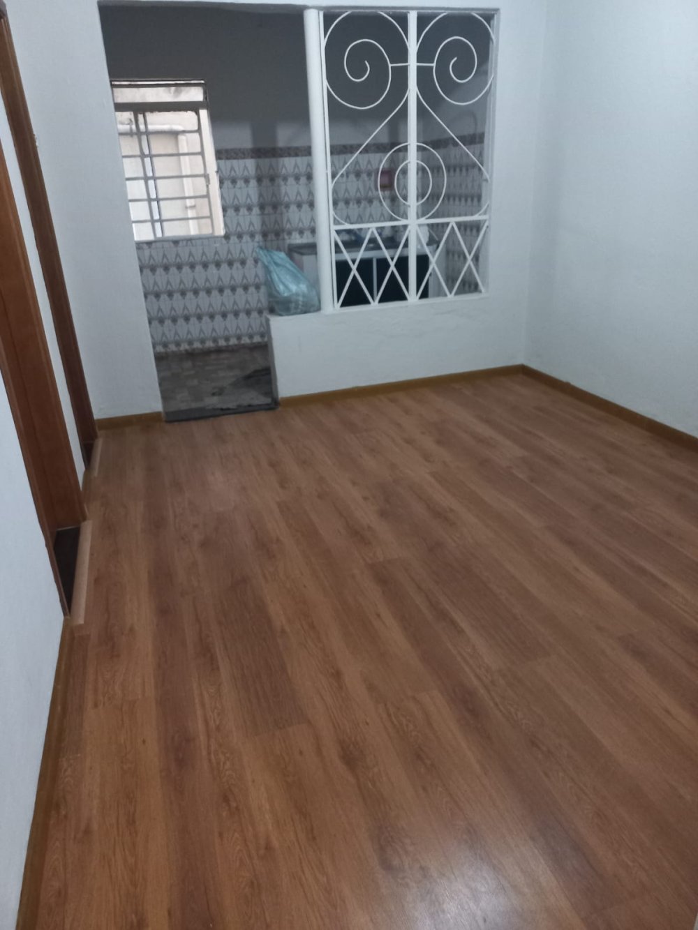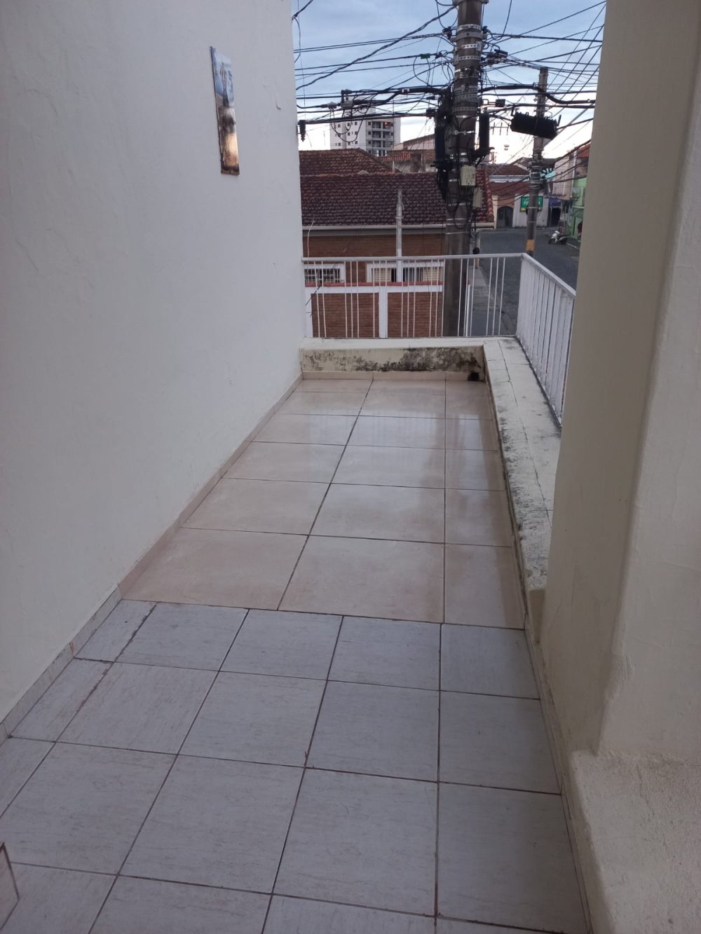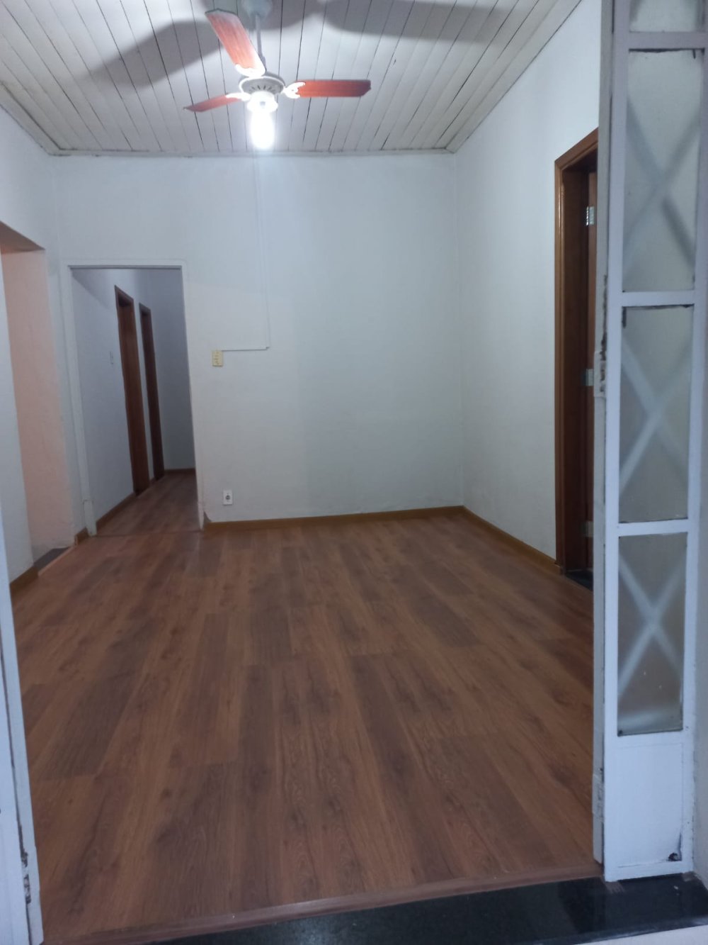 Piso frio e laminado, laje, cozinha e banheiro azulejados até o teto, box acrílico, ventilador de teto na sala.