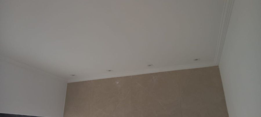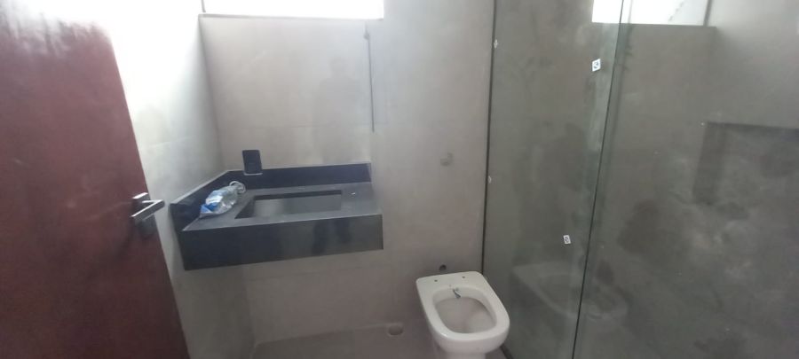 Piso porcelanato, laje, banheiro azulejado até o teto, janelas e box de Blindex, teto rebaixado com led.